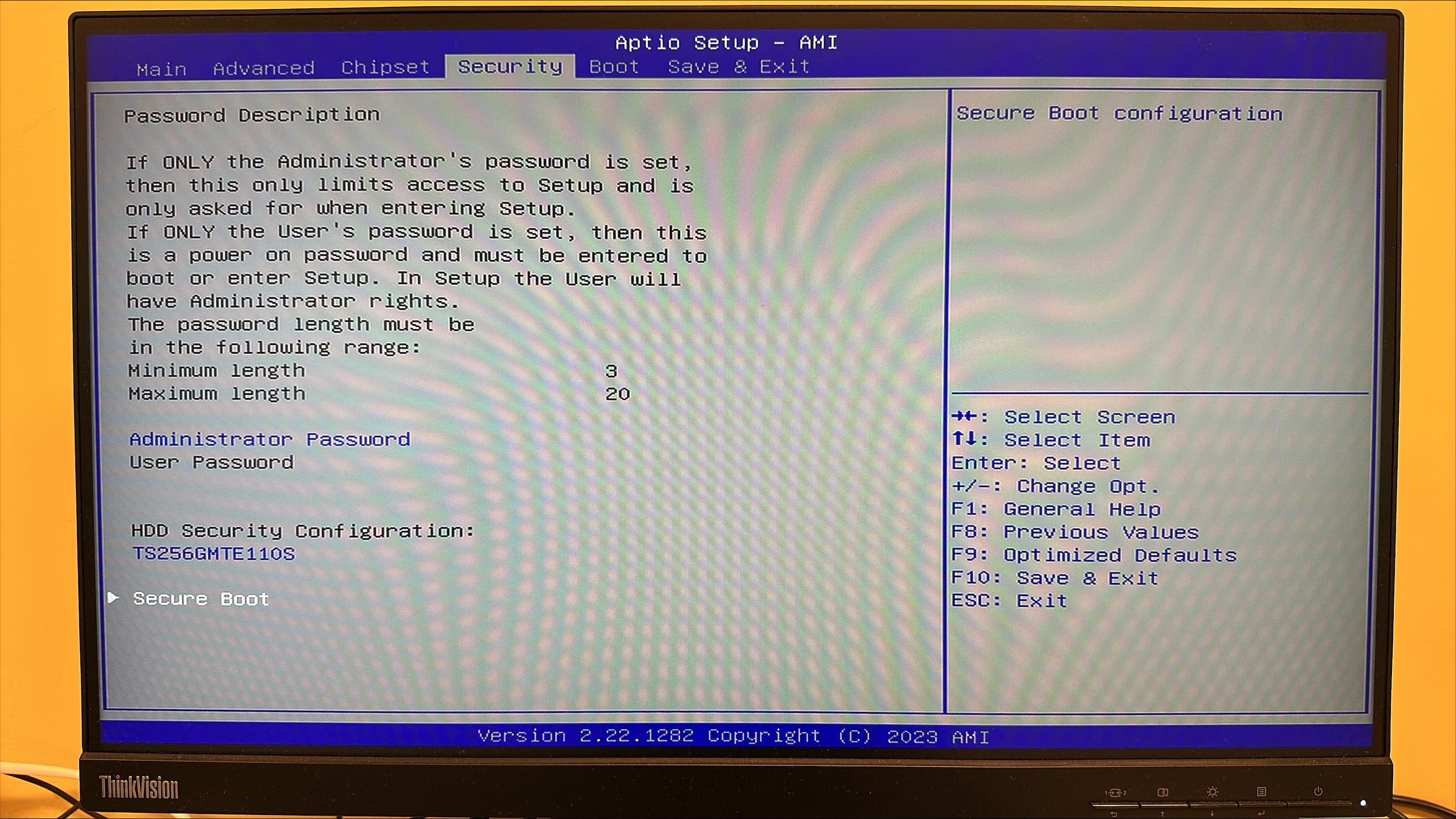 Tabblad Security Ga naar Secure Boot en bevestig met de enter-toets.
