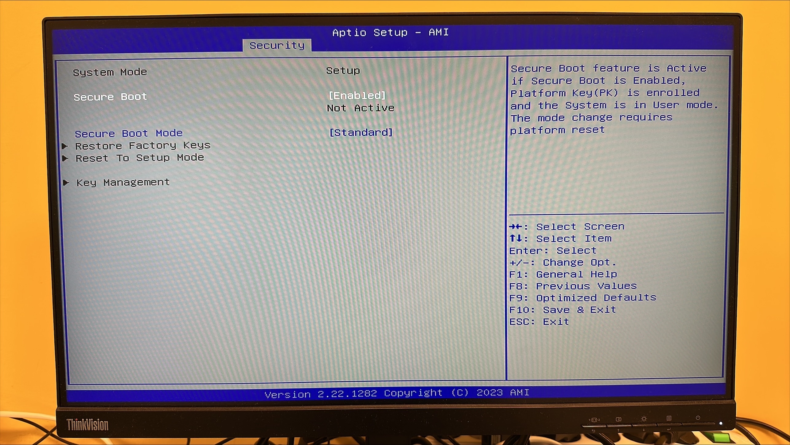 Tabblad Secure Boot - Controleer of achter Secure Boot het woord [Enabled] staat. Staat hier [Disabled], gebruik de plus-toets (+) om de waarde te wijzigen in [Enabled].