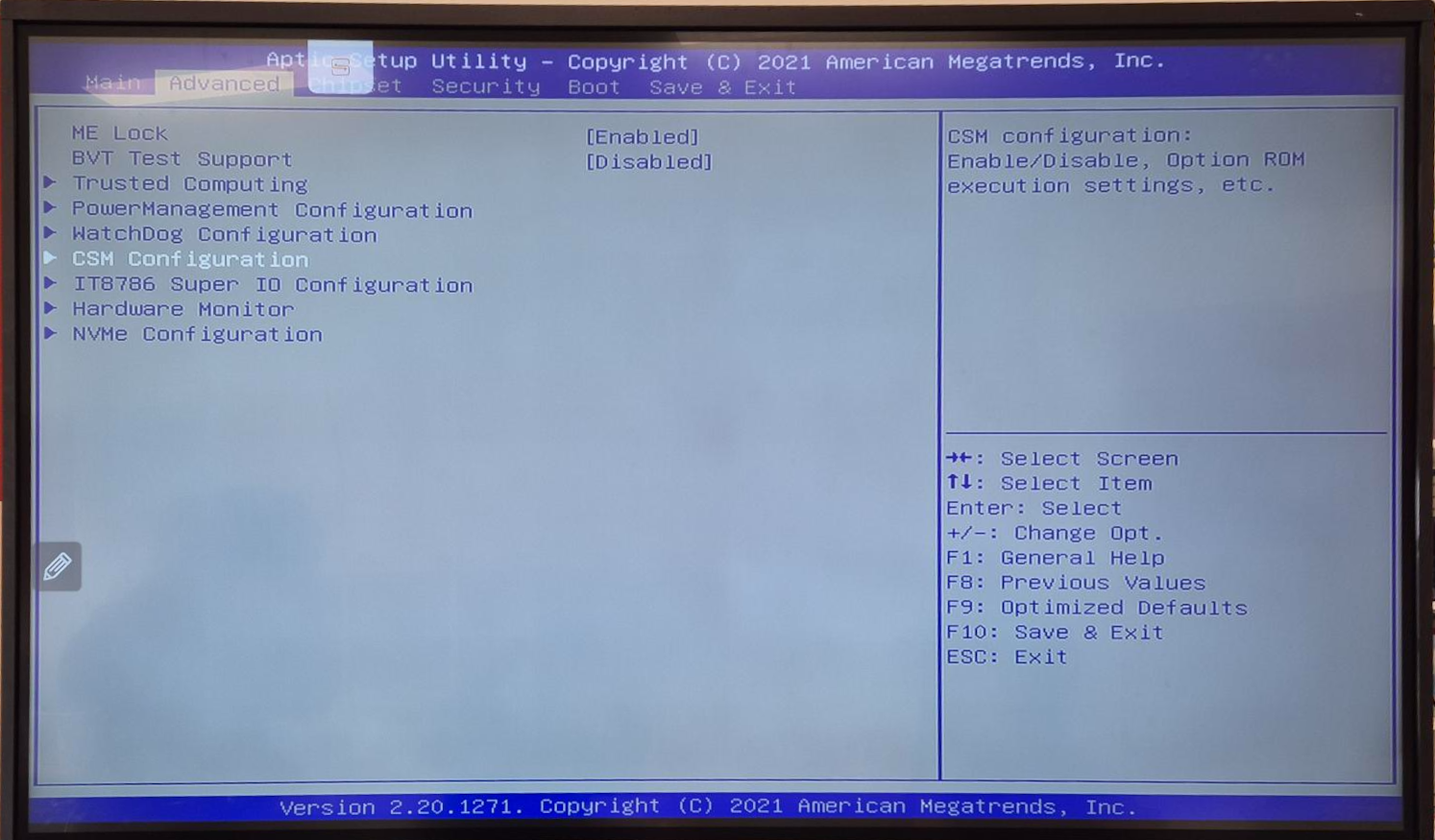Tabblad Advanced - Ga naar CSM Configuration en bevestig met de enter-toets.