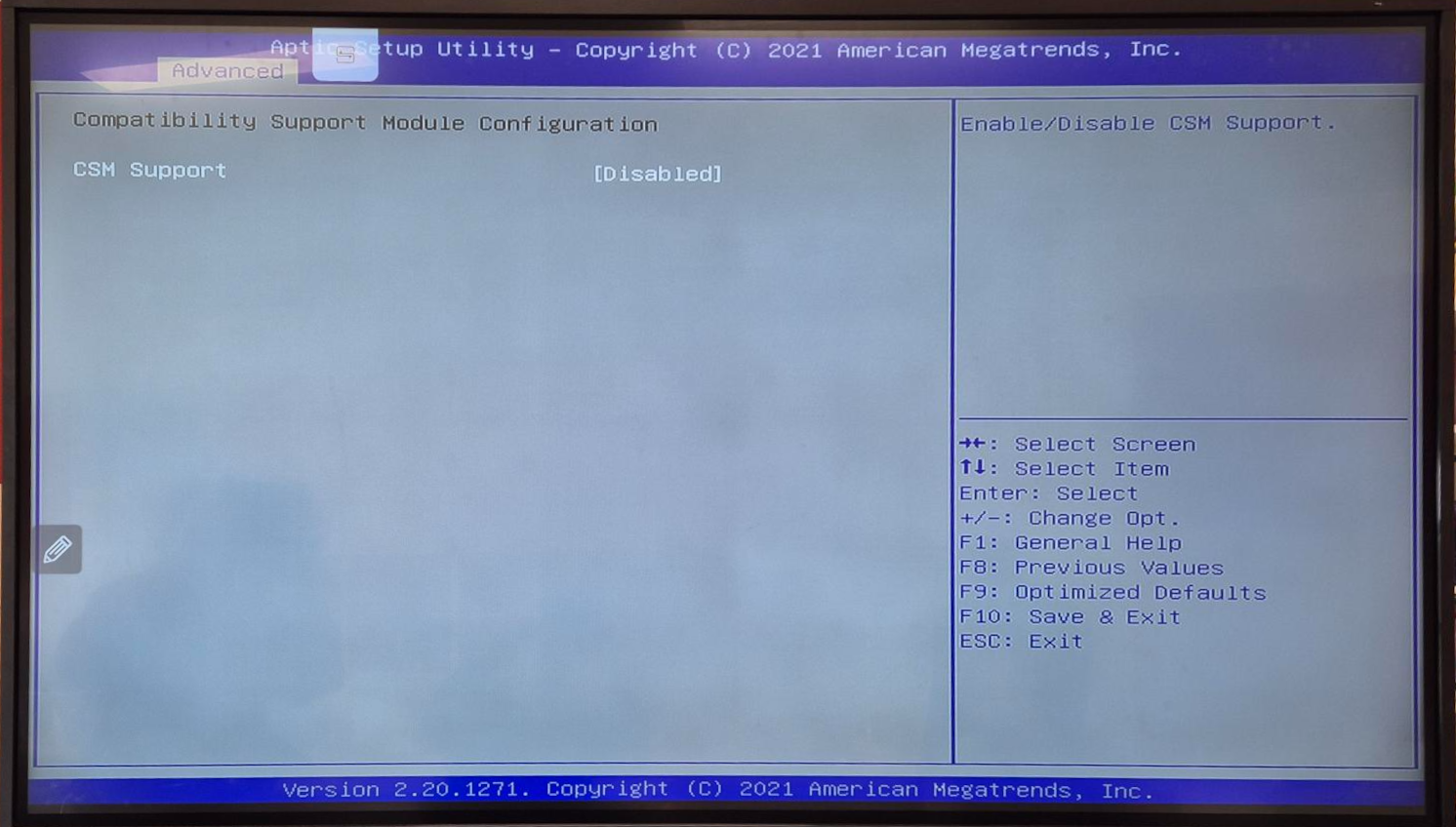 Zorg met de pijltjes dat CSM Support op Disabled staat.