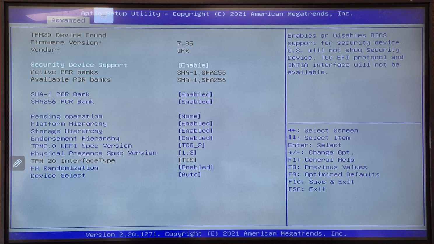 - Advanced - Trusted Computing - Security Device Suport: Enable